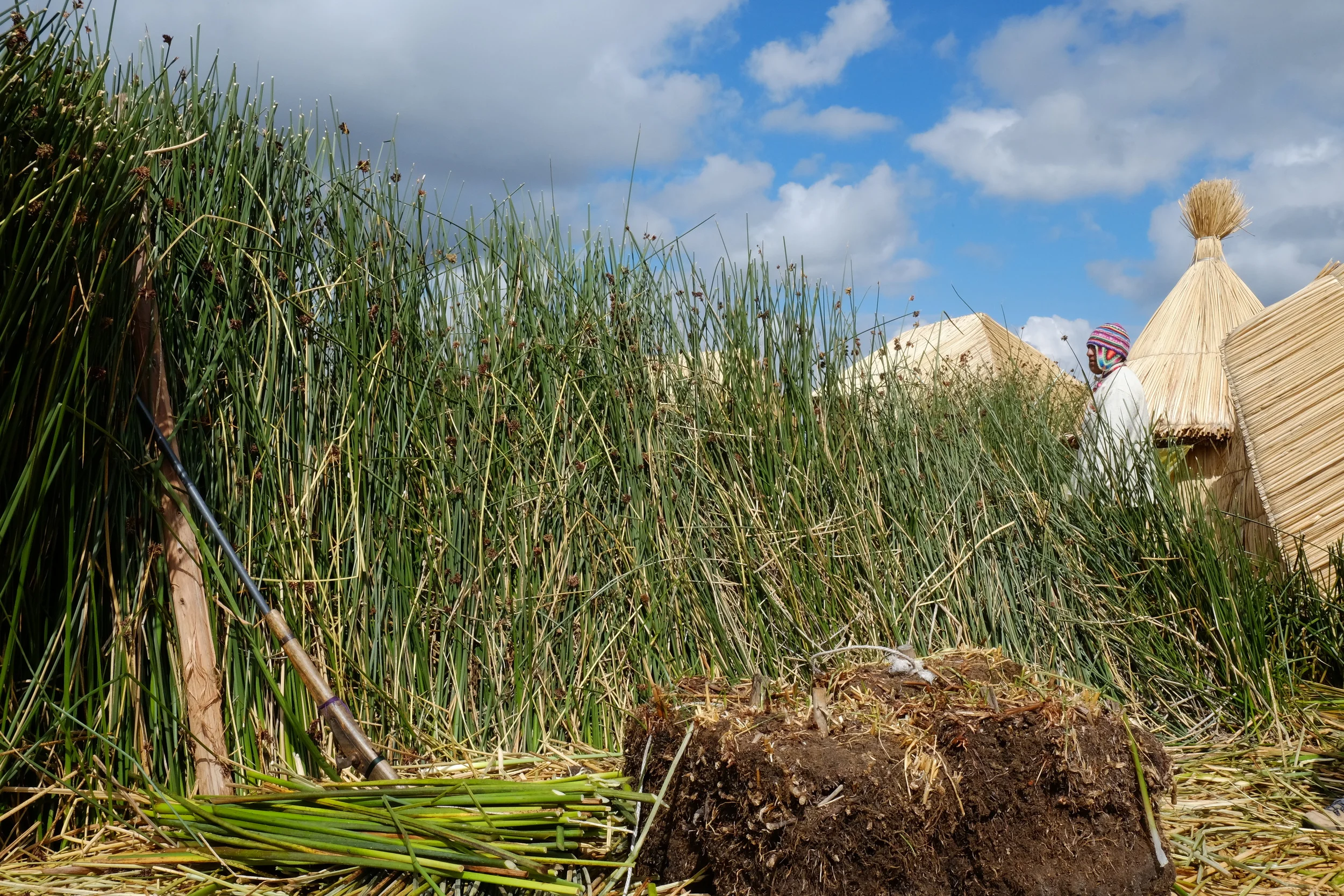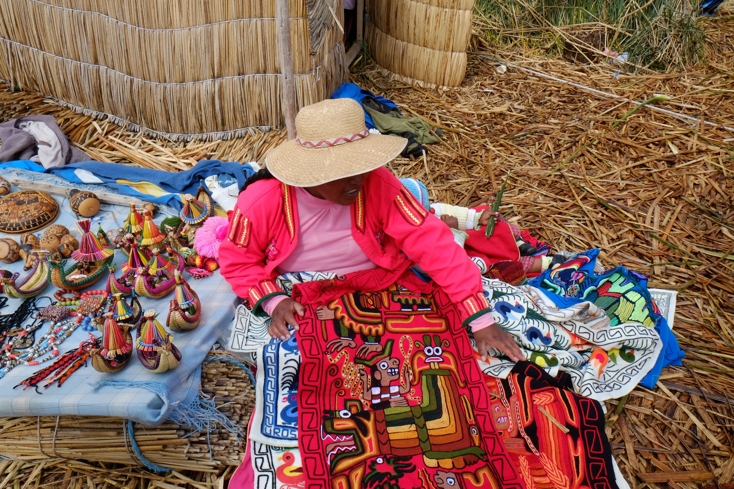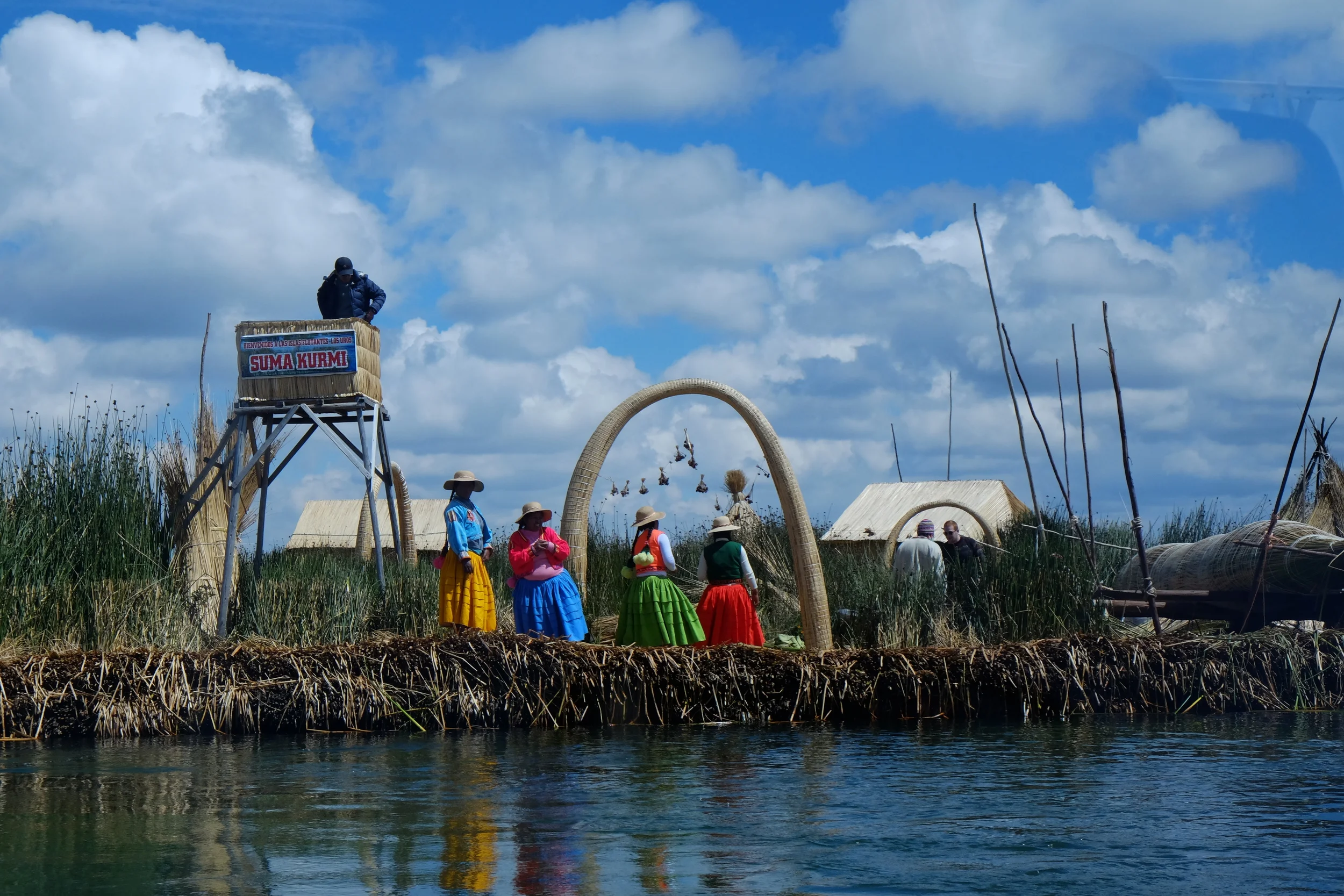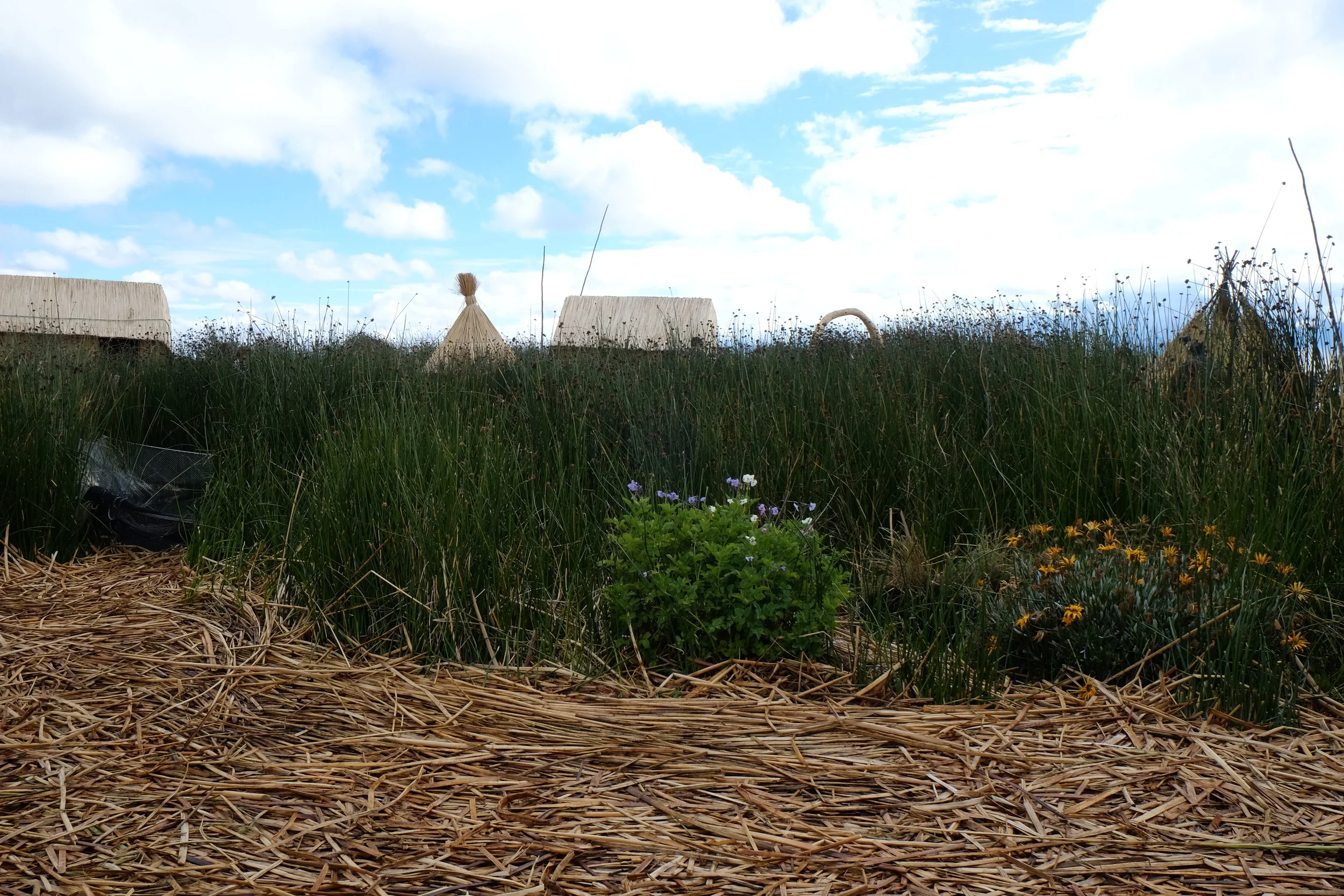 We made the 12-hour journey by bus from Cuzco to Puno and visited the man-made floating island of Uros the same morning we arrived. Four families, 15 people, live on this island. We found the women to be particularly lovely, dressed in their colorful skirts and vests, their long braided hair adorned with poms, their smiles wide and faces round, tinted by long exposure to the sun. The island is just one of many in the region and is made of a layer of roots measuring one meter in thickness and another layer of reeds in equal proportion. The reeds, along with fish, are a source of sustenance for these families who eat them directly from the lake. Once a month they also make a run into town for goods not as easily accessible. Electricity is solar powered. We didn't think at the time to ask about toilets and showers, though I've been quite curious since.