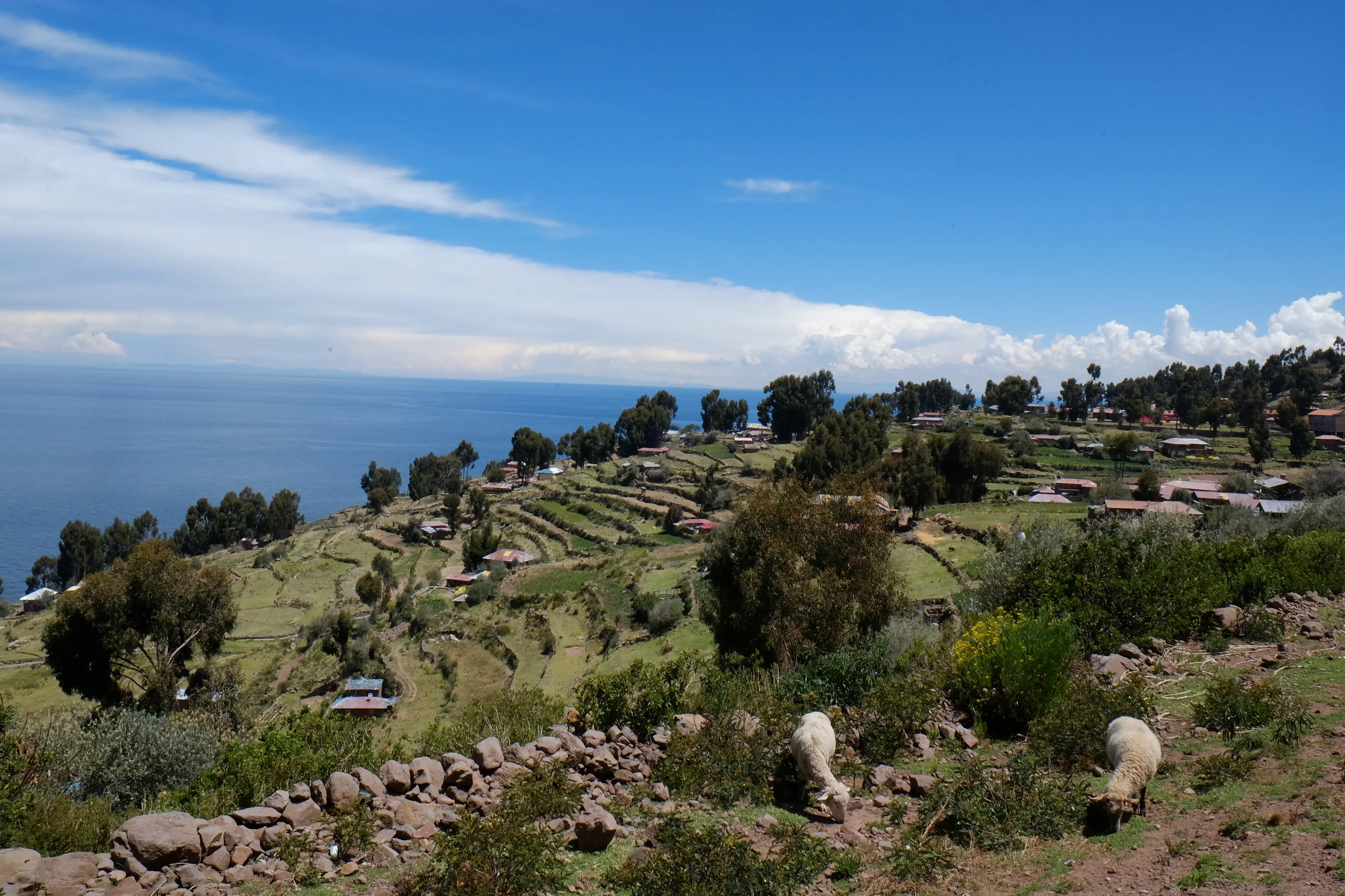 Lake Titicaca is a massive body of fresh water that stretches between Peru and Bolivia and that is home to a few thousand people. The ongoing Peruvian joke is that the Titi part resides in Peru and the Caca part in Bolivia. The name itself is said to mean 'puma stone' because, with some creativity, the lake takes after the animal's form.